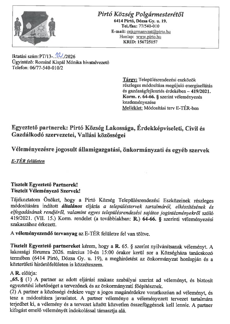 6414 Pirtó, Dózsa György utca 19.Email: onkormanyzat@pirto.huTelefon / Fax: 77/540-010Adatvédelmi szabályzatElektronikus ügyintézési adataink:Önkormányzat rövid neve: PIRTOONKKRID azonosító: 156725157