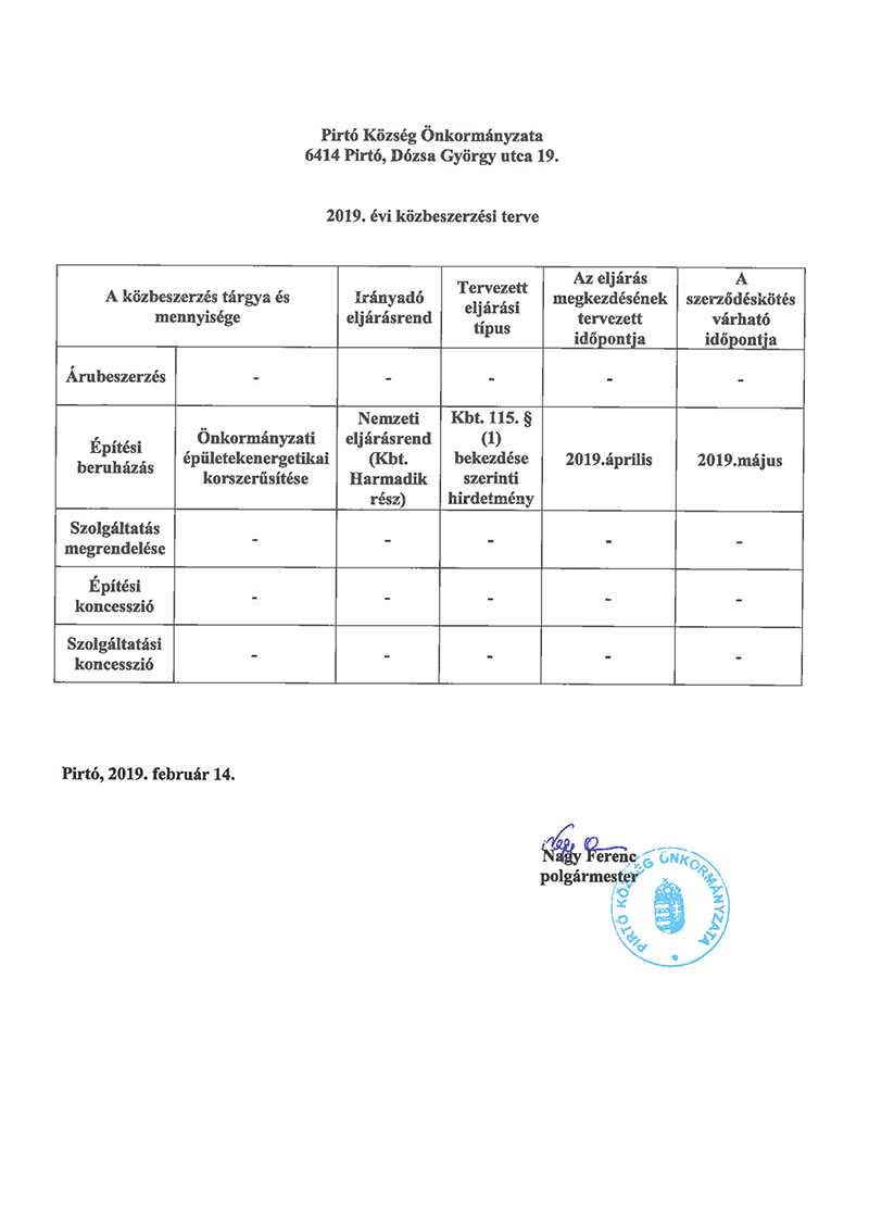 - Bontási eljárás jegyzőkönyve és jelenléti íve2019. évi közbeszerzési terv