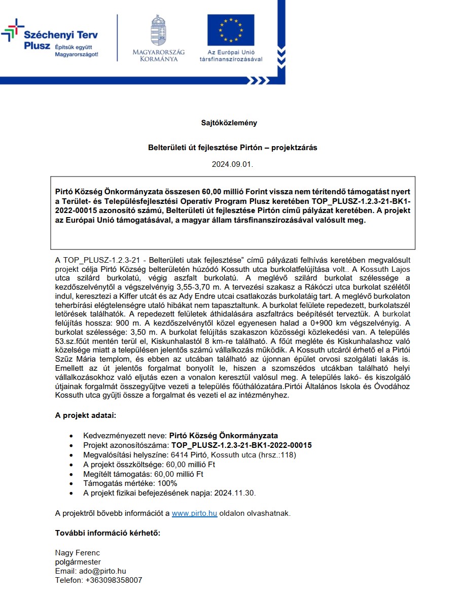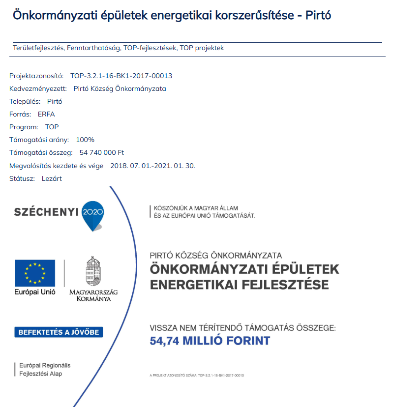 A kedvezményezett neve: Pirtó Község Önkormányzata, 6414 Pirtó, Dózsa György út 19.